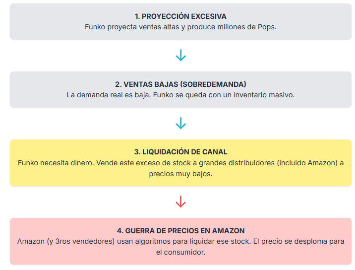 Funko siempre jugó en el mundo mayorista, vendiendo toneladas a Amazon, Walmart o Target, y creyendo que mientras el volumen siguiera subiendo, todo estaría bien. Spoiler: no estuvo bien. Cuando Funko se pasó años produciendo por encima de sus posibilidades, esas montañas de stock le dieron a Amazon la llave del castillo. Con tanto inventario por quitarse de encima, Amazon podía negociar precios ridículos, del tipo “lo tomas o te lo comes”. Y cuando Amazon consigue Pops a precio de saldo, el siguiente capítulo es inevitable: te despiertas un martes, abres la app, y ves figuras nuevas vendiéndose a 8–11 dólares como si fueran llaveros.