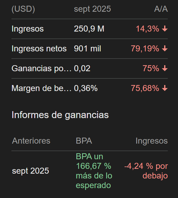 La parte graciosa es que los analistas esperaban un BPA muchísimo peor, y Funko terminó entregando un dato 166,67% más alto de lo previsto. Vamos, que todos esperaban un desastre, y Funko trajo… un desastrito controlado. Pero justo cuando parecía que podían presumir, viene la vuelta de tortilla: los ingresos estuvieron un 4,24% por debajo de lo que el mercado esperaba. Más rentables por acción, pero vendiendo menos de lo previsto. Es como vender menos Funkos, pero al menos no rebajarlos en Amazon a precio de chicle.